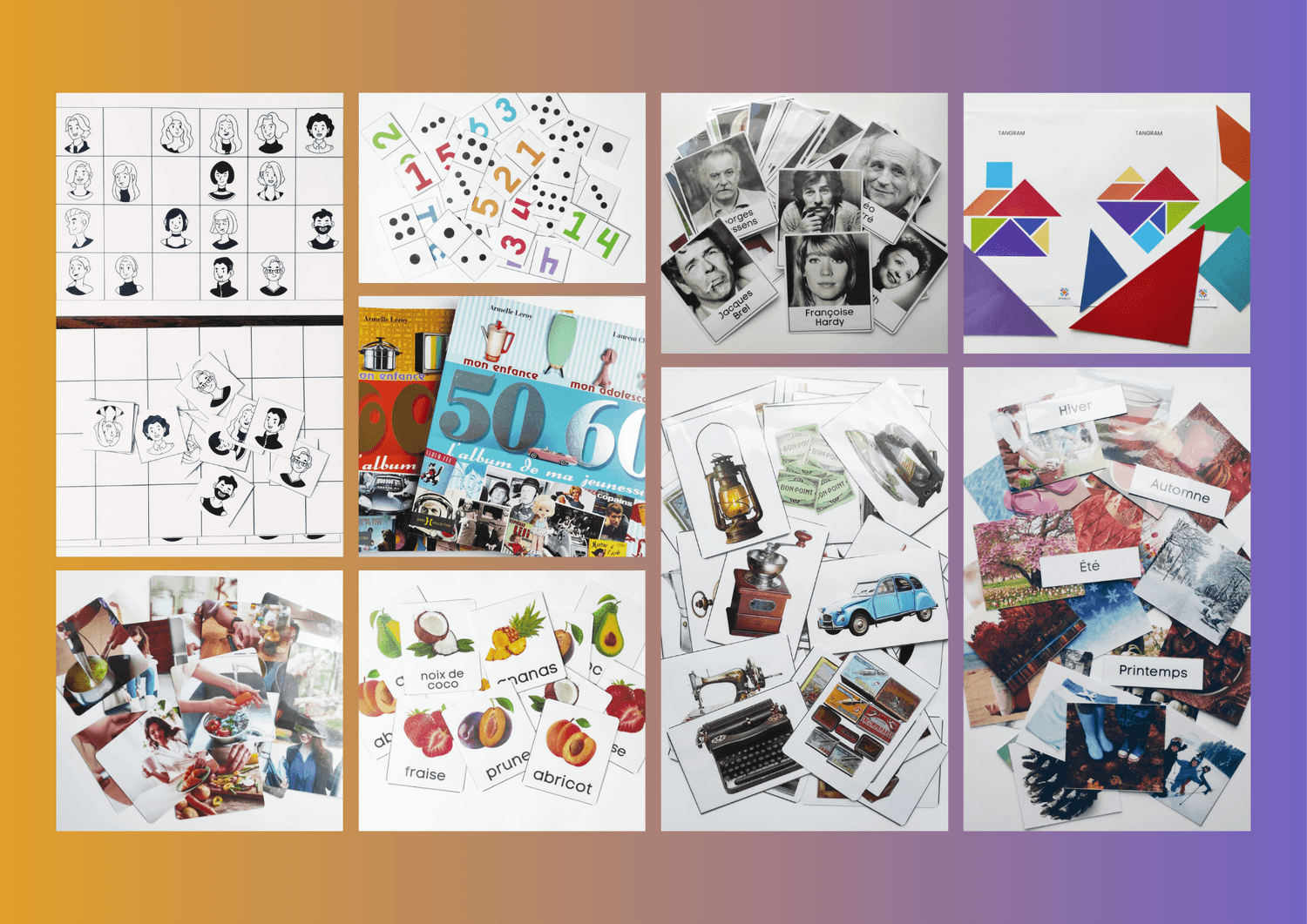 Les activités sont simples, concrètes et adaptées : jeux de réflexion, activités de manipulation, supports visuels, échanges autour de souvenirs, exercices ludiques, activités fonctionnelles en lien avec le quotidien.